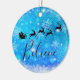 Christmas themed ornament with a black silhouette of santa riding in his sleigh being pulled by his reindeer flying across the sky. Believe written in a trendy red script font. The background is an icy blue frosty snowflake design.