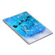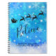 Christmas spiral notebook with a black silhouette of Santa riding in his sleigh being pulled by his reindeer flying across the sky. Believe written in a trendy script font. The background is an icy blue frosty snowflake design. Personalize with a name and title.