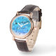 Christmas watch with a black silhouette of Santa riding in his sleigh being pulled by his reindeer flying across the sky. Believe written in a trendy script font. The background is an icy blue frosty snowflake design. Art deco clock face.