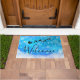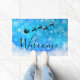 Christmas doormat with a black silhouette of Santa riding in his sleigh being pulled by his reindeer flying across the sky. Welcome written in a trendy script font. The background is an icy blue frosty snowflake design.