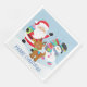 This whimsical design features Santa Claus, an adorable reindeer and a snowman. All are walking in a winter wonderland carrying colorful Christmas presents. Text can be customized.