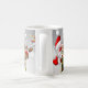 Santa claus and reindeer behind a christmas tree.j coffee mug