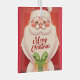 Illustration of Santa Claus holding a gift with a green bow, set against a red background, with the words "Merry Christmas" written in red cursive on his beard. The illustration is designed to resemble a square Christmas ornament, complete with a white string at the top for hanging. The style is reminiscent of vintage holiday cards, with clean lines and a limited color palette.