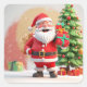 Santa Claus joyfully holding a gift and surrounded by decorated Christmas tree. The festive scene illustrates celebration, joy, and holiday spirit.