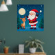 Illustration of cheerful Santa Claus with Rudolph the red-nosed reindeer under a moonlit winter sky surrounded by snowy trees.