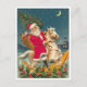 Vintage illustration of Santa Claus on a white wooden horse, carrying a Christmas tree with colorful baubles and a basket full of toys under a clear blue night sky with a bright shining moon and stars on a cold winters night.