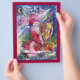 Colorful, whimsical and artistic acrylic painting ,Santa is playing harp in the moonlight ,an owl ,floral ornaments,winter plants,children toys,holly berries in bright red,green,white,blue,yellow colors. by Bulgan Lumini (c)