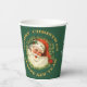 These Christmas paper cups feature a wonderful retro portrait of Santa Claus surrounded by holly sprigs. He is framed with gold curved text that says "Merry Christmas" and "Happy New Year". The image is printed twice on the cups, and your custom text is in white at the center. Everything is placed on a Holiday green background.
