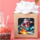 Santa Claus performs an exciting skateboard trick over a glowing fire in a winter skate park. Dressed in his classic red suit, he brings festive cheer while showcasing impressive skills against a nighttime backdrop with illuminated trees.