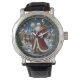 This image features a detailed, Santa Claus Stained Glass Holiday Scene Watch design resembling a stained glass roundel or medallion. The central scene depicts a traditional Santa Claus figure carrying a sack of gifts, walking through a snowy village at night. He holds a staff topped with a glowing star. The background includes several snowmen, reindeer, small houses with glowing windows, and a crescent moon. The entire illustration is framed by an ornate, gold and colored border with stylized green, blue, and yellow leaf and vine elements. The design has a highly decorative, mosaic-like appearance.