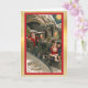 The front of this Holiday greeting card features a vintage fine art image of Santa Claus driving a train through a tunnel with two children as passengers, and a full bright moon in the sky. The image is placed on a light infused gold gradient background, and is bordered in red with a thin gold line.. The inside of the card has the gold background on the left and the other side is white, and partially left blank for your own message, with custom text fields for your signature at the bottom. Celebrate Christmas the old fashioned way with this beautiful card showcasing an image from days gone by.