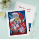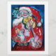 Colourful, whimsical and artistic acrylic painting ,Santa is playing violin in the snowy winter night ,an owl ,floral ornaments,winter plants, holly berries in bright red,green,white,blue,yellow colors.