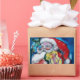 Colourful, whimsical and artistic acrylic painting ,Santa is playing violin in the snowy winter night ,an owl ,floral ornaments,winter plants, holly berries in bright red,green,white,blue,yellow colors.