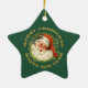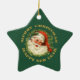 This holiday ornament has a touch of nostalgia, with a retro image of Santa with his red and white stocking cap and bushy white beard. He wears a sprig of holly with a red berry. The portrait is surrounded by a wreath of pine needles on a forest green background. Half circle glittery gold text at the top says Merry Christmas, and at the bottom Happy New Year. Both sides of the ornament have the same image and text. *Please note - the image is printed and does not contain actual glitter.*
