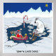 Santa says, ““!@#$*% Climate Change,” as his sleigh sinks in some water and reindeer hang onto an ice floe with a polar bear.