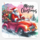 Santa is joyfully driving a vintage red car adorned with colorful gifts and festive decorations. The snowy background complements the cheerful colors, creating a delightful holiday atmosphere, as he spreads Christmas cheer while on a winter journey.