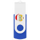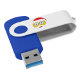 A blue and white USB drive features a cartoon Santa Claus emoji on the white part. The emoji has a yellow face, a white beard and mustache, and wears a red Santa hat and round glasses.