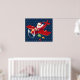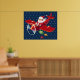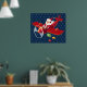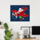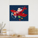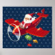 Santa flying an airplane and dropping wrapped gifts. Background is a dark blue with snowflake pattern poster.