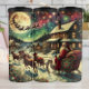 This artwork shows Santa’s sleigh slicing through a starlit sky, drawn by reindeer and brimming with brightly wrapped gifts. A brilliant moon lights his way as he soars above a peaceful village dressed in snow and sparkle. It’s a breathtaking moment of holiday magic suspended in the clouds.