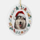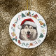 Here's a beautiful personalized ornament for anyone who loves an Alaskan Malamute dog. The front has a watercolor Malamute dog wearing a red and white Santa hat. The image is framed within a colorful circle wreath made up of various Holiday images, including a snowman, bells, candy cane, stocking, holly, and more! The back of the ornament has the same wreath image with your custom text in green and red.