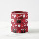 A Christmas mug featuring a pattern of Santa outfit elements, like the hat, boots, and fake beard. The mug has a red background. The words "Merry Christmas" can be customized.