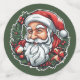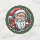 Sticker with the head of Santa Claus and a beautiful Christmas wreath. Digitally created in colorful cartoon style.