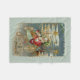 Here comes Santa! He is steering his amazing flying machine through the night sky. Stars, streamers and fancy decorations bedeck the aircraft and its load of wonderful toys for Christmas morning. The restored image of a Victorian postcard features a frosty background, gold accents and beautiful, bright colors. It is framed in icicles and ornaments with a Christmas village in the background.