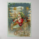 Here comes Santa! He is steering his amazing flying machine through the night sky. Stars, streamers and fancy decorations bedeck the aircraft and its load of wonderful toys for Christmas morning. The restored image of a Victorian postcard features a frosty background, gold accents and beautiful, bright colors. It is framed in icicles and ornaments with a Christmas village in the background.