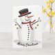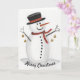 This Christmas card features an original watercolor painting of a jolly snowman in a top hat, adorned with golden baubles and sporting a red and gold striped scarf. Inside, the greeting reads "Wishing you peace, warmth and joy at Christmas and all year long. Merry Christmas!"