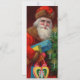 This elegant Santa, dressed in traditional red, is delivering Christmas gifts and a candle lit tree. It is a beautiful image for holiday decor and correspondence. Santa wishes everyone a Merry Christmas in golden lettering while a shining Christmas star sparkles in the background.
