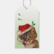 This pack of gift tags features two adorable brown, orange and white tabby cats dressed for the Christmas holiday season as Santa Claus in red hats trimmed with white fur. One is on the front, the other on the back. Both have sprigs of holly and berries for decoration.