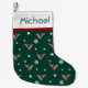 This fun Christmas stocking features a mallard duck in a Santa hat amidst snowflakes on a hunter green background. Personalize with the name of your choice.