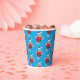 Fun Christmas paper cups with a pattern of manatees in Santa outfits on a blue background.