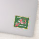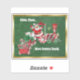 This vinyl sticker has Santa Claus riding a Christmas train with peppermint candy wheels carrying letters to Santa and Candy canes on a dark green background with a shiny gold border and the text "choo, choo.... Here Comes Santa.