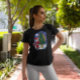 My 11 yo wore adult XL (5’7” 165#). The 8yo is small framed. She wore adult small and tied it in the back. Grandma wore adult large with long sleeve shirt underneath. Tall girl adult medium. Dark haired male adult large. Good quality dark Heather gray, Gildan brand shirt. -it was next up from basic choice and cost about $20 per shirt. Not too thick or thin. Washed and dried well, no major shrinkage. Not see-through. Can wear a bra under it fine. Screen print is just as shown and well done, front and back.