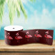 A ribbon with pink flamingos in Santa outfits on a burgundy background.