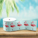 A Christmas ribbon with pink flamingos in Santa outfits on a blue background.