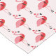 A fun and festive Christmas table runner with a pattern of pink flamingos in Santa outfits on a pink background.
