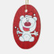 Cute white Christmas polar bear wearing a red Santa hat and a big smile is holding a red and white striped candy cane against a red starburst background.