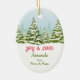 Santa Claus and one of his reindeer ride in a red truck on the front of this cute Christmas ornament that is appropriate for any child. Along with them are two decorated Christmas trees, and a snow covered forest is behind them. The back of the ornament has the forest scene, and your custom text in four easy to change text fields. Great for a grandchild, daughter, son, niece or nephew!