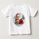 A digital illustration of a cute Santa Claus sitting in the snow hugging a baby reindeer