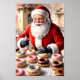 Step into a whimsical holiday bakery scene where Santa Claus, dressed in his classic red suit with a twinkling smile behind his spectacles, joyfully crafts a flurry of colorful donuts and treats. Against a cozy backdrop of soft pinks, creamy whites, and rich browns, Santa's bright blue eyes shine with excitement as he skillfully pipes on icing and sprinkles, his rosy cheeks glowing with holiday cheer. Vintage baking utensils and festive decorations adorn the space, blending retro charm with the magic of the season. This dreamy watercolor illustration invites you into a warm and nostalgic holiday spirit, perfect for those who cherish the sweetness of Christmas traditions.