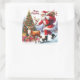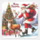 In a festive winter wonderland, Santa Claus joyfully skates alongside a reindeer, both surrounded by vibrant Christmas decorations.
