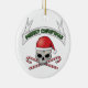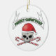 Santa skull with candy cane crossbones and a Merry Christmas greeting printed on a simple round Christmas ornament.