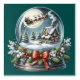This enchanting winter design captures the magic of Christmas Eve with Santa and his reindeer soaring across a glowing full moon inside a beautifully detailed snow globe. A cozy cottage nestled in a snow-blanketed forest glows warmly under the night sky, framed by frosted evergreens and holiday wreaths. The glass dome sparkles with falling snow, while the base is adorned with festive greenery, white berries, and a bold red bow, adding an extra touch of holiday cheer. Perfect for seasonal decorating inspiration, this whimsical scene evokes the wonder of childhood memories and storybook winters. The soft lighting, traditional holiday elements, and nostalgic charm make this a heartwarming addition to any Christmas-themed collection. AI generated artwork.