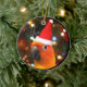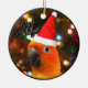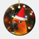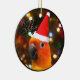 Cute Sun Conure ornament! The green parrot wears a bright red Santa hat in front of a colorful winter background. Fun for the bird lover's Xmas tree this holiday season.