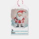 A festive Christmas tag showcases a jolly Santa Claus waving, adorned in his classic red suit. Snowflakes gently fall around him, capturing the spirit of the holiday season.