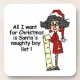 Funny holiday T-shirts, mugs, cards, stickers, buttons, bags, keychains, ornaments, and more sure to make anyone laugh features a female in a Santa hat and red dress with a long list saying "All I want for Christmas is Santa's naughty boy list!".