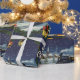 This festive wrapping paper is perfect for adding a touch of traditional Christmas charm to your gifts! It features a repeating pattern on a deep blue, snowy background. Each section includes a classic Santa Claus holding a glowing lantern, a vintage-style steam train chugging through a snowy village with quaint houses and pine trees, and a "Merry Christmas" script intertwined with holly and jingle bells. The overall design evokes a nostalgic, magical winter wonderland feel, ideal for holiday presents.