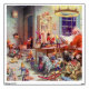 A beautiful vintage wall decal featuring Santa with his elves in the workshop.